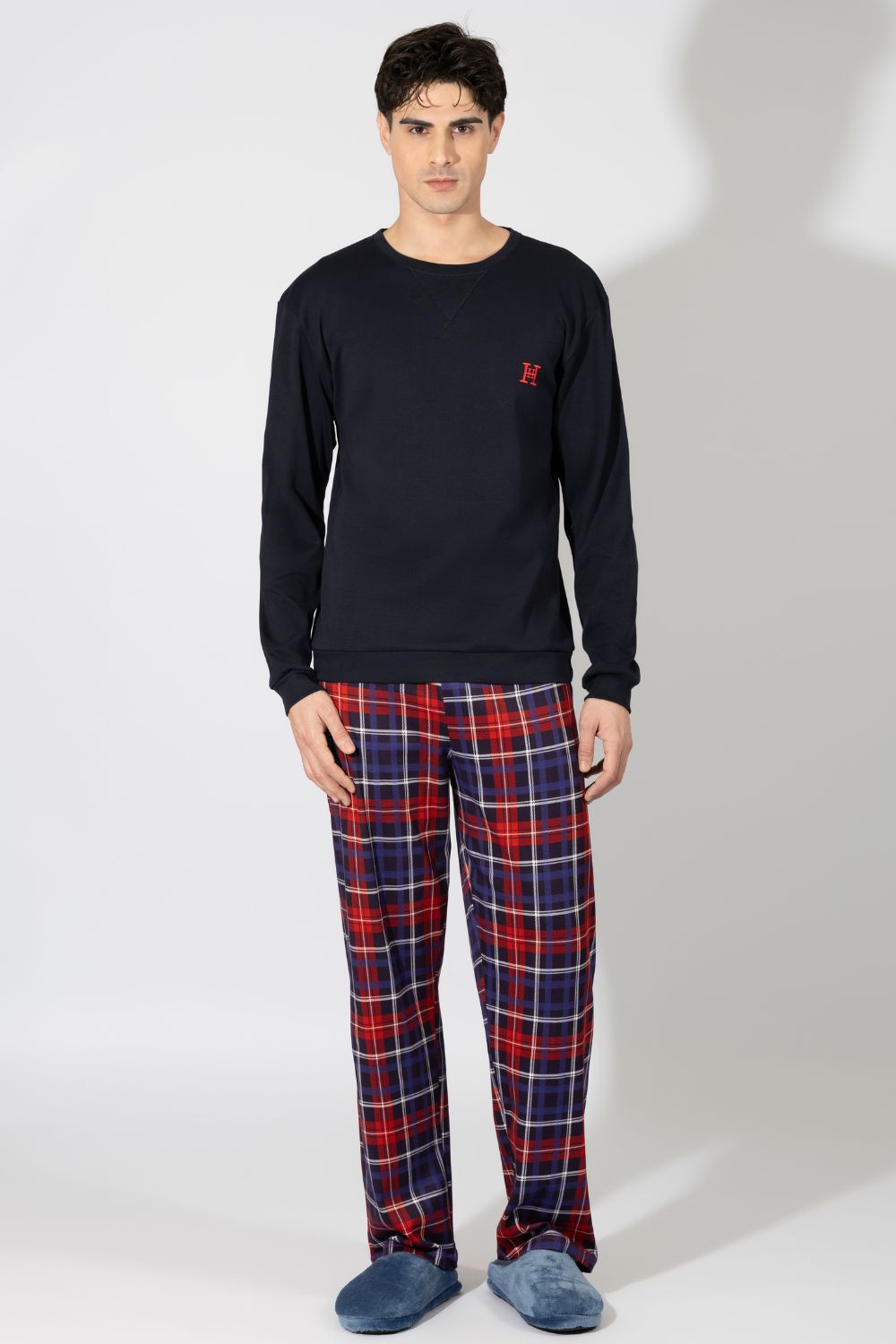 Η ανδρική πιτζάμα Harmony Καρό είναι κατασκευασμένη από 100% βαμβάκι, προσφέροντας άνεση και ευχάριστη αίσθηση σε κάθε χρήση. Η μακρυμάνικη μπλε μπλούζα διαθέτει διακριτικό τύπωμα “H” στο στήθος, ενώ το παντελόνι ολοκληρώνει το σύνολο με κομψό καρό μοτίβο σε αποχρώσεις του μπλε και του κόκκινου. Ένα κλασικό και άνετο σετ, ιδανικό για καθημερινή χαλάρωση στο σπίτι.