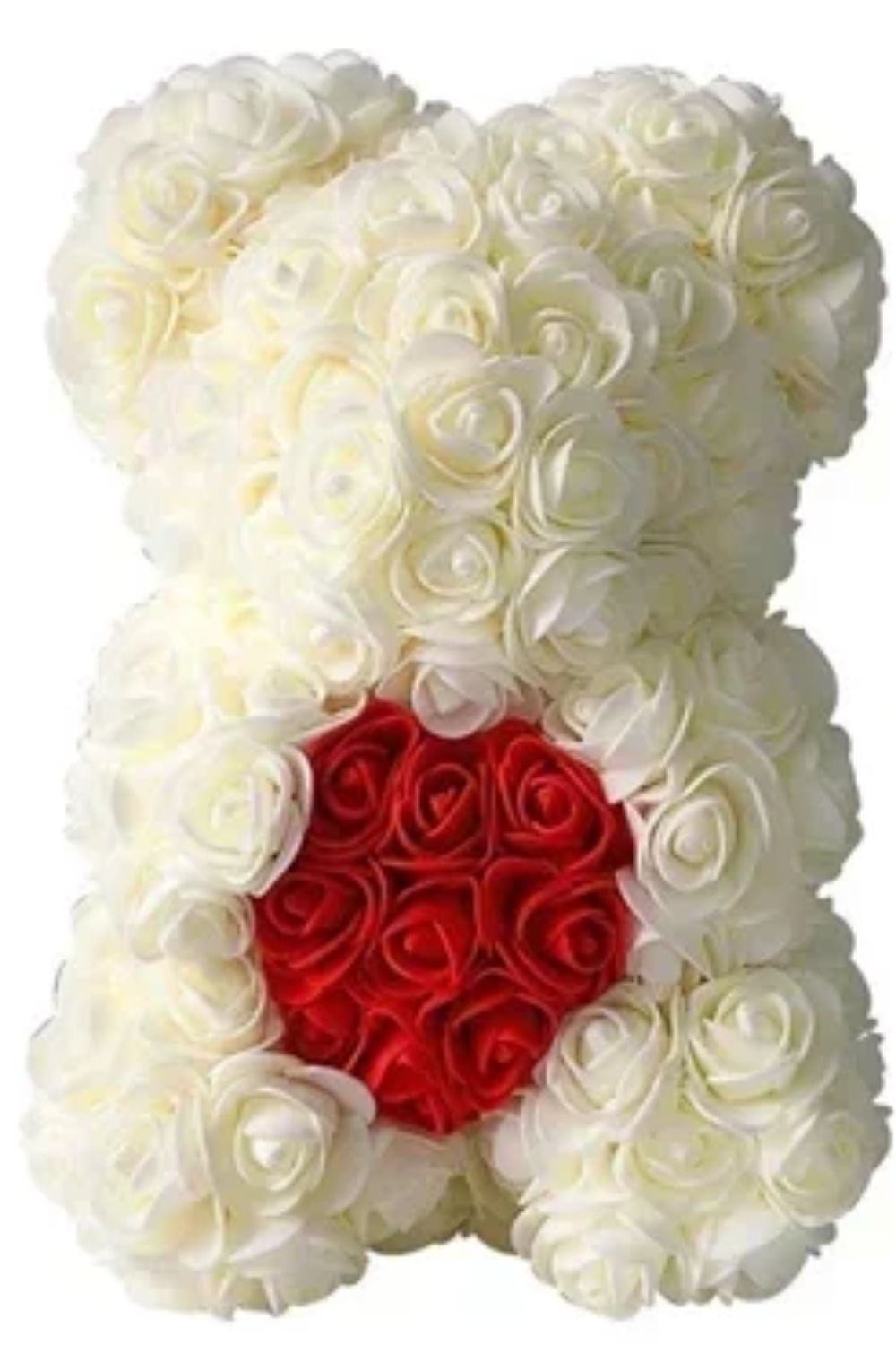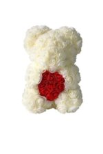 Αρκουδάκι ύψους 25cm, κατασκευασμένο από συνθετικά τριαντάφυλλα, σε λευκή απόχρωση. Λόγω της επεξεργασίας που έχει υποστεί μπορεί να διατηρήσει τη φυσική του ομορφιά και κομψότητα για χρόνια. Συνοδεύεται σε συσκευασία δώρου, με διακοσμητική κορδέλα. Για να παρατείνετε τον χρόνο ζωής του, διατηρήστε το στο κουτί του σε θερμοκρασία δωματίου.