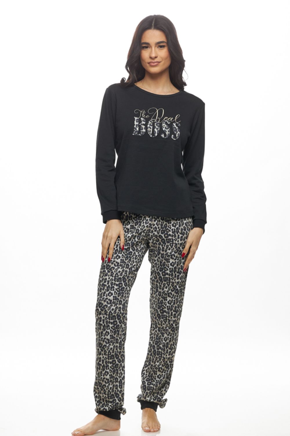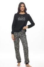 Γυναικεία πιτζάμα Galaxy “The Real Boss” από 100% βαμβάκι για απόλυτη άνεση και φυσική αίσθηση. Η μακρυμάνικη μπλούζα είναι μονόχρωμη με τη φράση “The Real Boss” στο μπροστινό μέρος, ενώ το παντελόνι σε animal print χαρίζει μοντέρνο και παιχνιδιάρικο στυλ. Ιδανική για χαλάρωση στο σπίτι με άνεση και προσωπικότητα. Ελληνικό προϊόν της εταιρείας Galaxy.