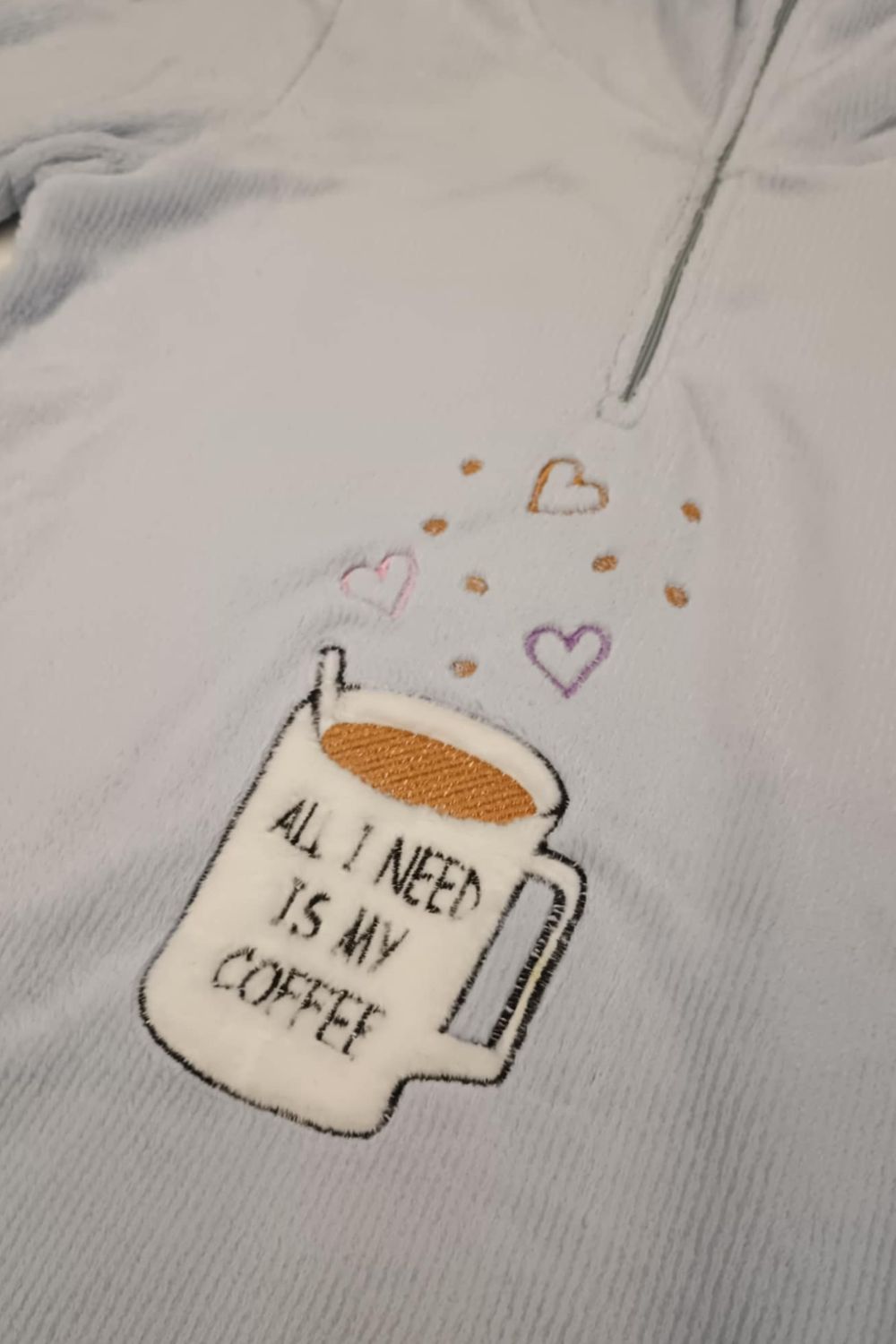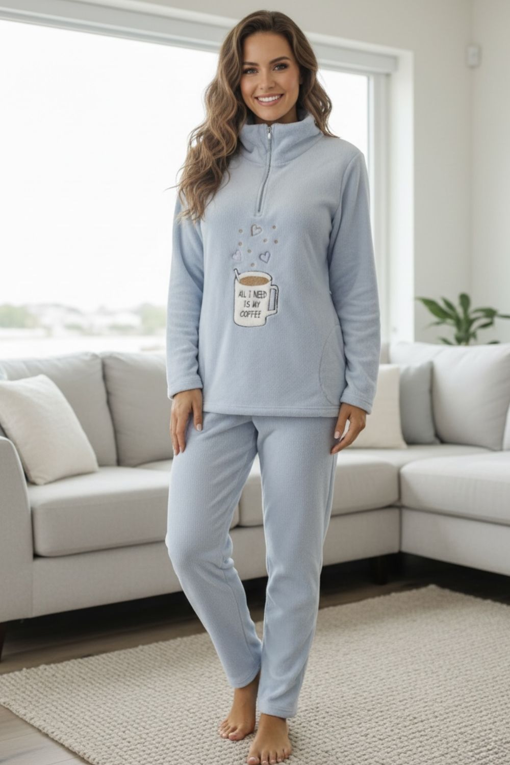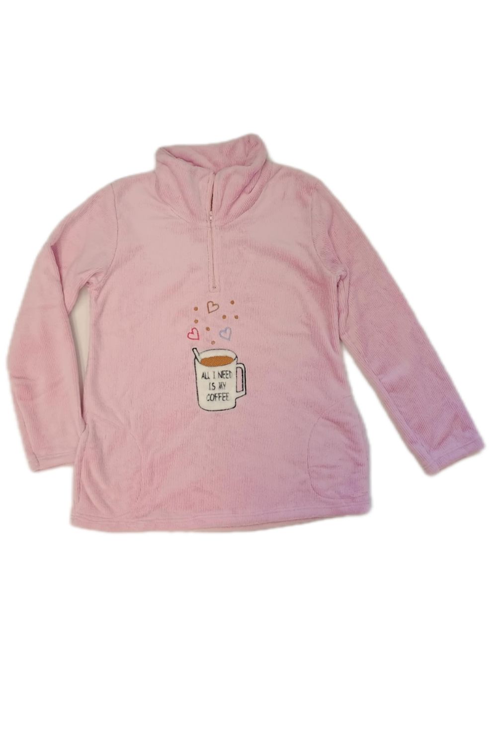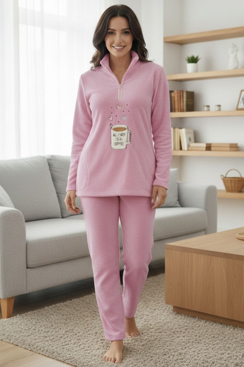 Γυναικεία πιτζάμα Koyote “All I Need My Coffee” από Coral Fleece, με ζεστή και απαλή υφή για απόλυτη άνεση. Η μπλούζα διαθέτει φερμουάρ σαν πατιλέτα και χαριτωμένο σχέδιο με μια κούπα καφέ και το μήνυμα “All I Need My Coffee”, προσθέτοντας παιχνιδιάρικο και cozy χαρακτήρα. Ιδανική επιλογή για χαλάρωση στο σπίτι και ζεστές πρωινές ή βραδινές στιγμές.