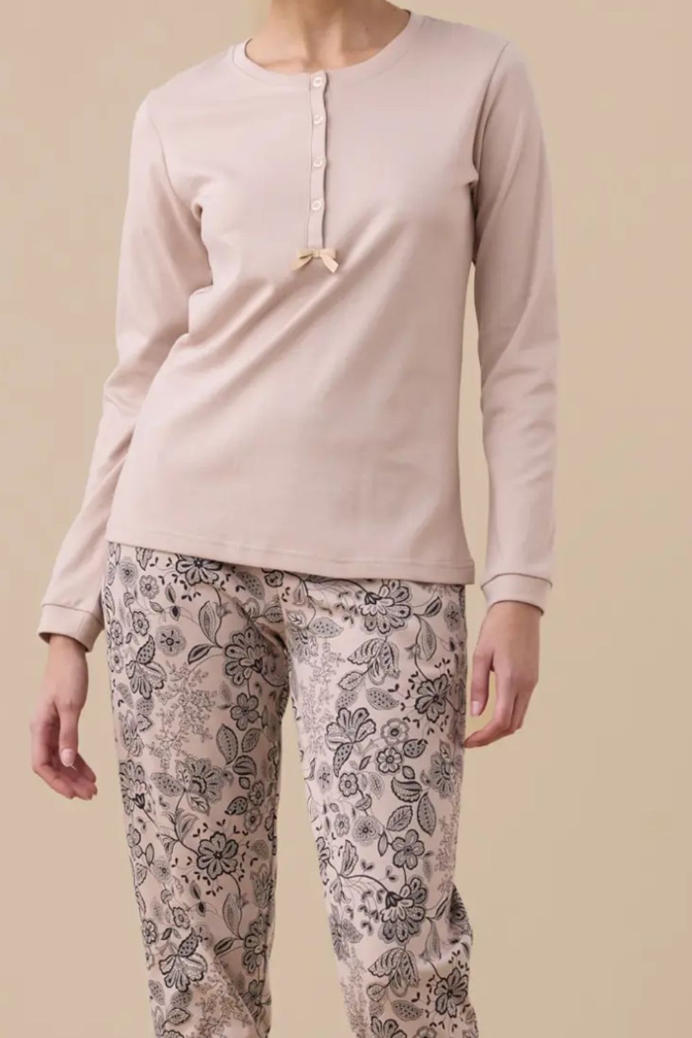 Η γυναικεία πιτζάμα Noidinotte “Flower” συνδυάζει άνεση και κομψότητα, ιδανική για χαλαρές στιγμές στο σπίτι. Η μπλούζα είναι μονόχρωμη με πατιλέτα και τέσσερα κουμπιά για πρακτική εφαρμογή, ενώ το παντελόνι ξεχωρίζει με το all-over floral σχέδιο που προσφέρει φρεσκάδα και θηλυκότητα. Κατασκευασμένη από απαλό ύφασμα με σύνθεση 80% βαμβάκι και 20% πολυεστέρα, προσφέρει ευχάριστη αίσθηση και αντοχή, αποτελώντας μια ιδανική επιλογή για καθημερινή χρήση.