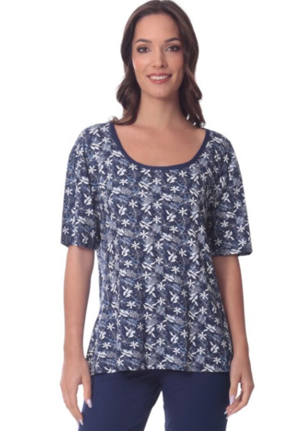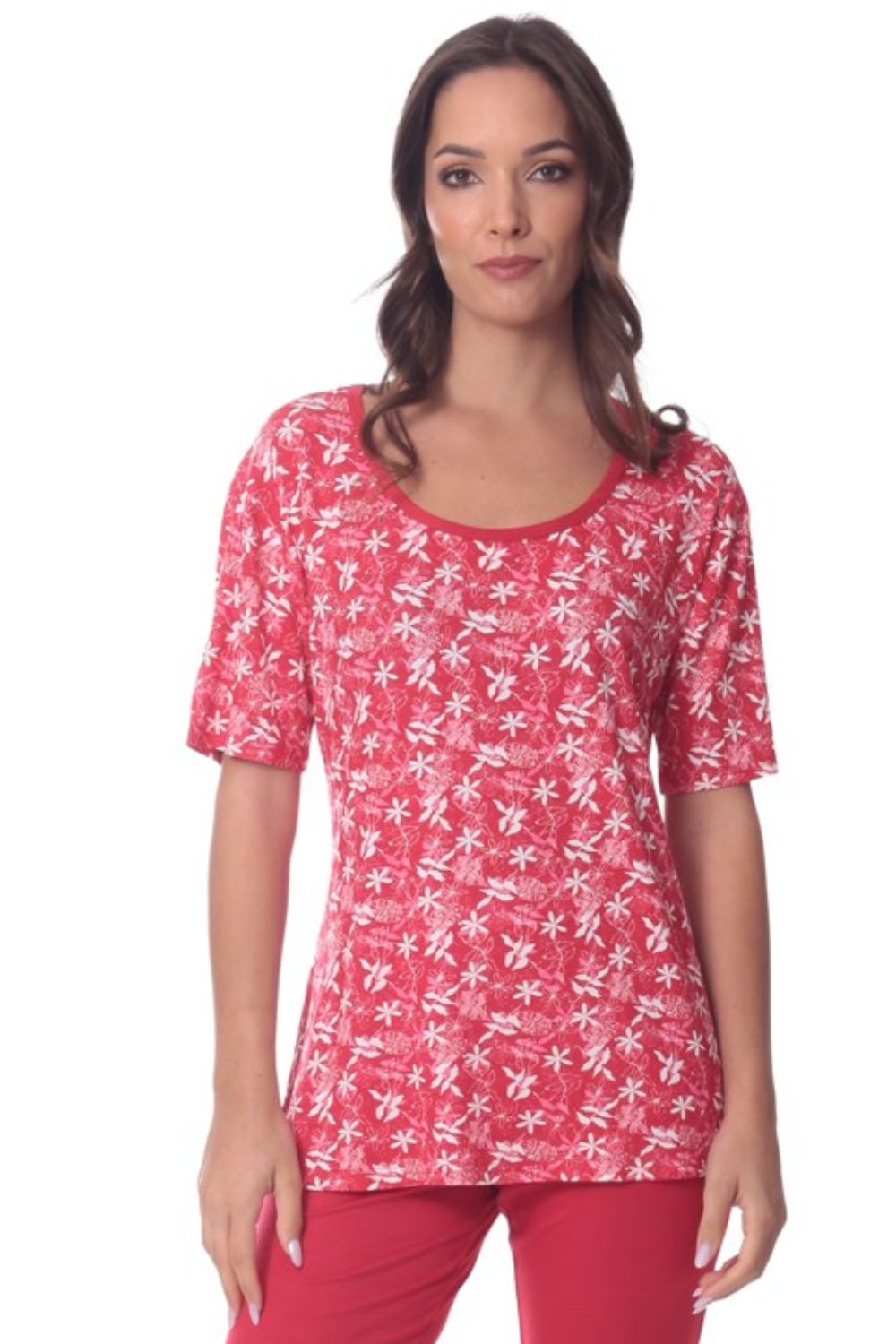 Γυναικεία πιτζάμα κάπρι από εξαιρετικά απαλή και δροσερή σύνθεση 95% viscose και 5% spandex, ιδανική για άνεση και κομψότητα όλη τη νύχτα. Το σετ αποτελείται από κοντομάνικη μπλούζα με στρογγυλή λαιμόκοψη και μοντέρνο all-over σχέδιο, που χαρίζει θηλυκό και χαλαρό στυλ, καθώς και κάπρι παντελόνι που αγκαλιάζει το σώμα χωρίς να πιέζει. Το ελαστικό ύφασμα προσφέρει ελευθερία κινήσεων και άψογη εφαρμογή, καθιστώντας το ιδανική επιλογή τόσο για ύπνο όσο και για χαλαρές στιγμές στο σπίτι.