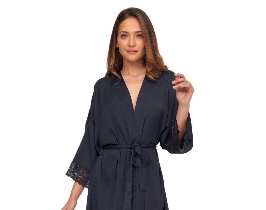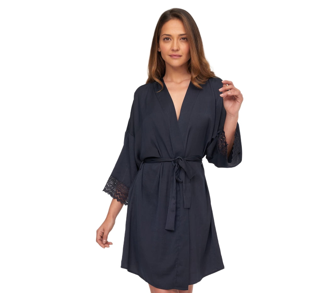 Γυναικεία Ρόμπα Σατέν Muydemi με λεπτομέρειες δαντέλας στο τελείωμα από τα μανίκια. Δένει στην μέση με ζωνάκι.