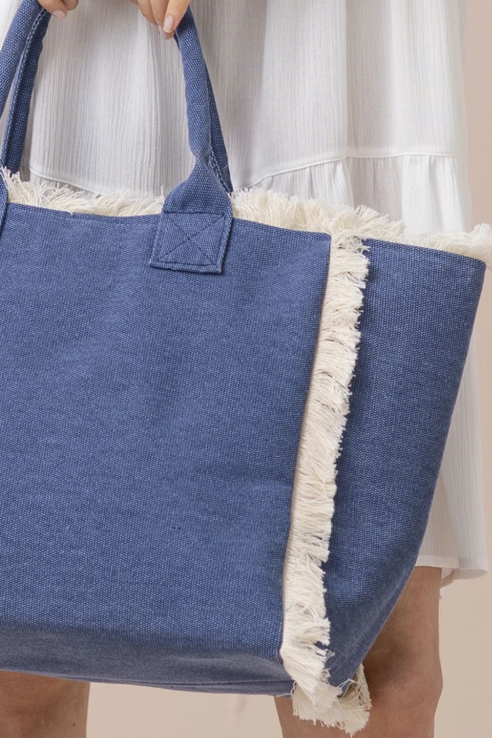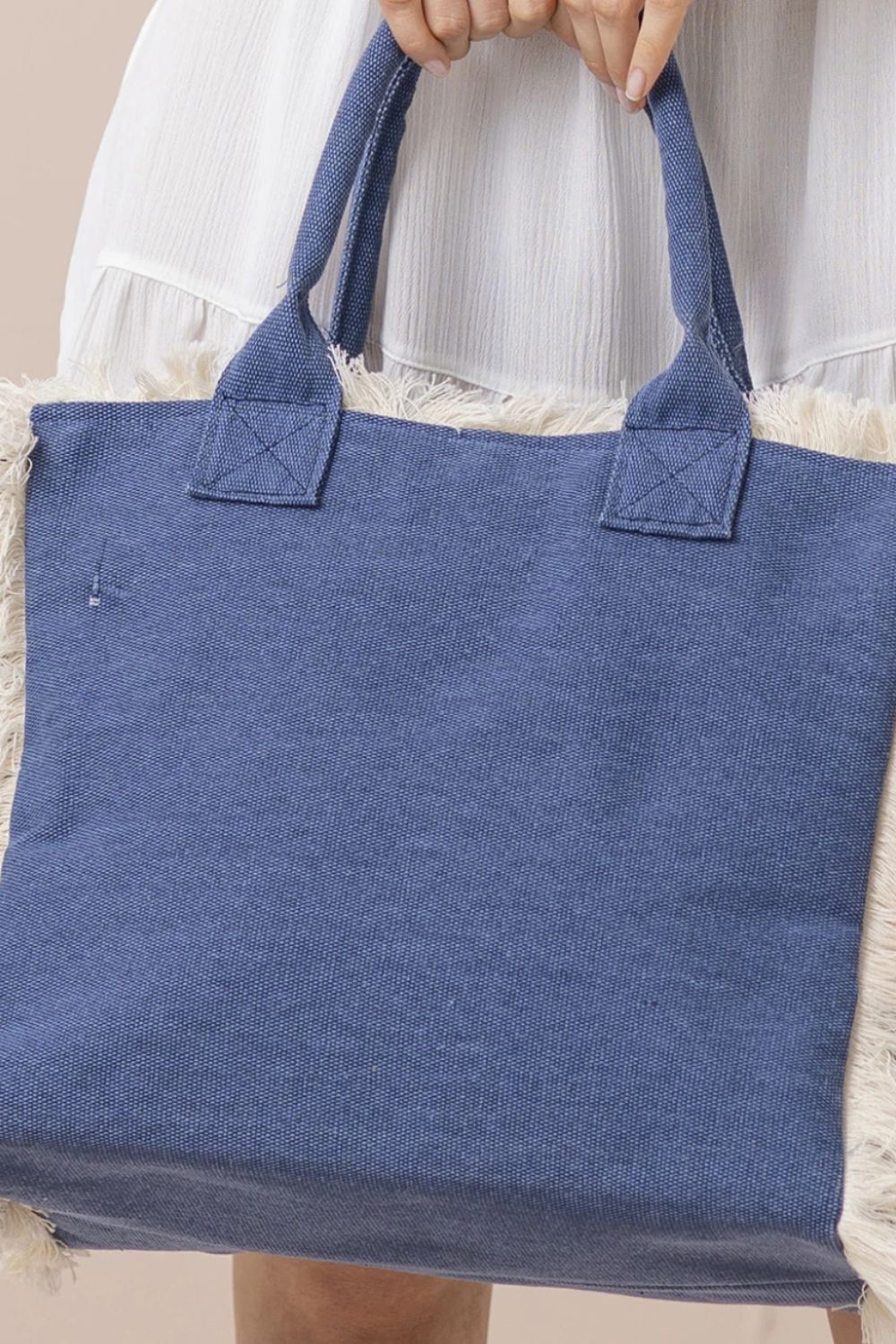 Γυναικεία τσάντα θαλάσσης NOIDINOTTE “Sunrise” με φερμουάρ, σε μοντέρνο εφέ denim που χαρίζει casual καλοκαιρινό στυλ. Διαθέτει πρακτικά χερούλια για εύκολη μεταφορά και εντυπωσιακές λεπτομέρειες με κρόσσια στα πλάγια για μια boho πινελιά. Ευρύχωρη και λειτουργική, ιδανική για την παραλία ή τις καλοκαιρινές σας εξορμήσεις.