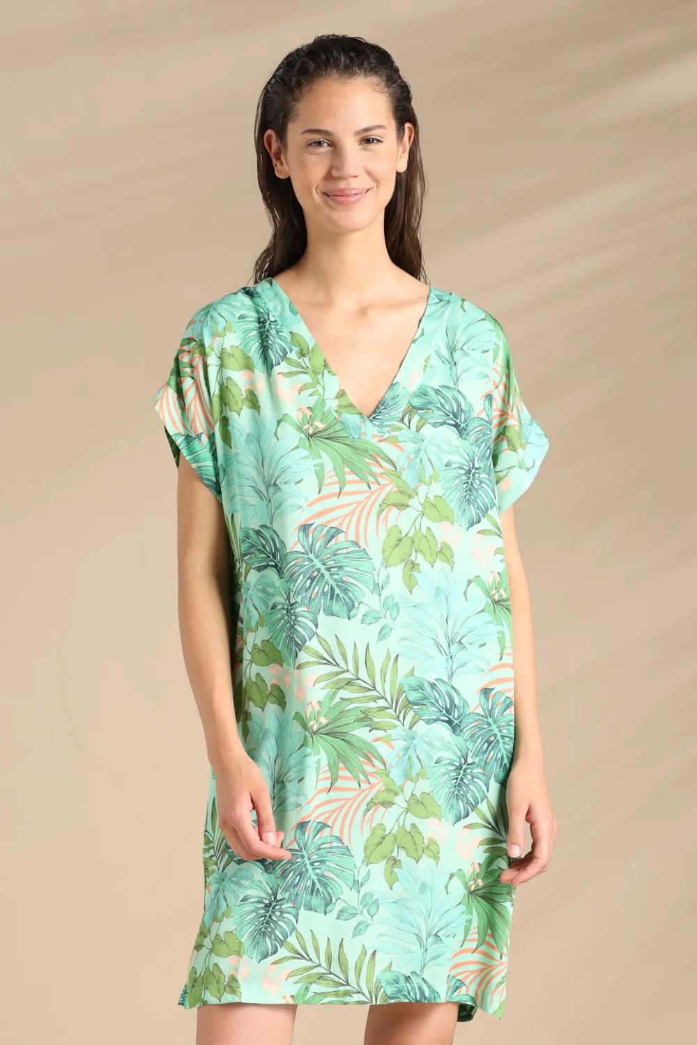 Ανάλαφρο και δροσερό, το γυναικείο φόρεμα “Tropical” της Noidinotte αποτελεί την ιδανική επιλογή για τις καλοκαιρινές εμφανίσεις. Κατασκευασμένο από απαλή βισκόζη που χαρίζει άνεση και φυσική κίνηση, διαθέτει κοντά μανίκια και κομψή V λαιμόκοψη που αναδεικνύει διακριτικά το ντεκολτέ. Το τροπικό μοτίβο με φύλλα σε ζωηρές αποχρώσεις προσθέτει φρεσκάδα και στιλ, ενώ η χαλαρή γραμμή του εξασφαλίζει ευκολία στην εφαρμογή καθ’ όλη τη διάρκεια της ημέρας. Ένα ευκολοφόρετο κομμάτι που συνδυάζεται ιδανικά με σανδάλια για casual chic εμφανίσεις.