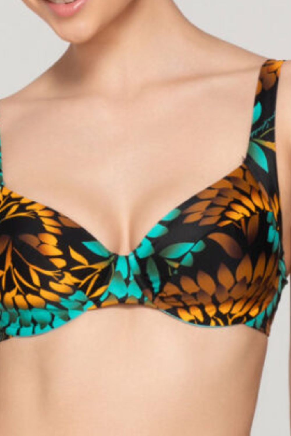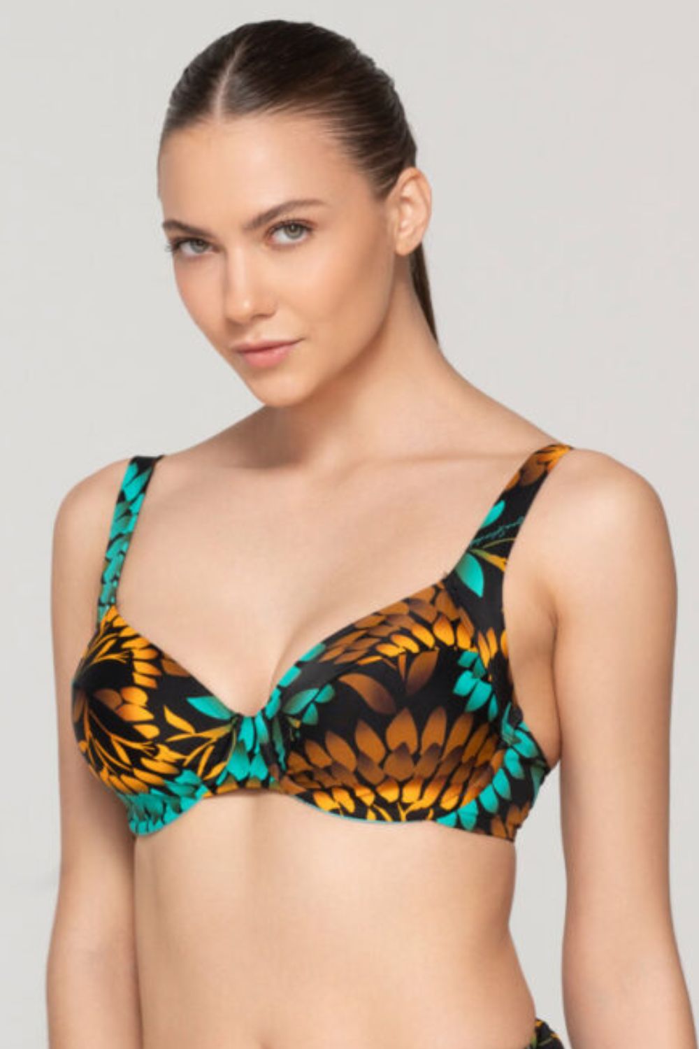 Το γυναικείο μαγιό Bikini Top Luna “Emerald” με cup D,E είναι ιδανικό για γυναίκες με μεγαλύτερο στήθος που αναζητούν άνεση, στήριξη και στυλ. Πρόκειται για μπικίνι μπαλκονέ χωρίς ενίσχυση, σε full cup γραμμή, που προσφέρει μεγαλύτερη κάλυψη και ασφαλή εφαρμογή. Κατασκευασμένο από μοναδικό εμπριμέ ύφασμα με μοτίβο φύλλων σε πράσινους, πορτοκαλί και καφέ τόνους, ξεχωρίζει για την φυσική κομψότητα και τη ζωντάνια του. Οι φαρδιές, ρυθμιζόμενες τιράντες δεν πιέζουν τους ώμους, προσφέροντας απόλυτη άνεση, ενώ το μεταλλικό κούμπωμα στην πλάτη εξασφαλίζει σταθερότητα. Ένα στιλάτο και λειτουργικό bikini top για εμφανίσεις με αυτοπεποίθηση.