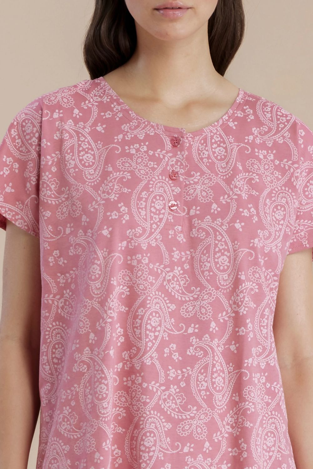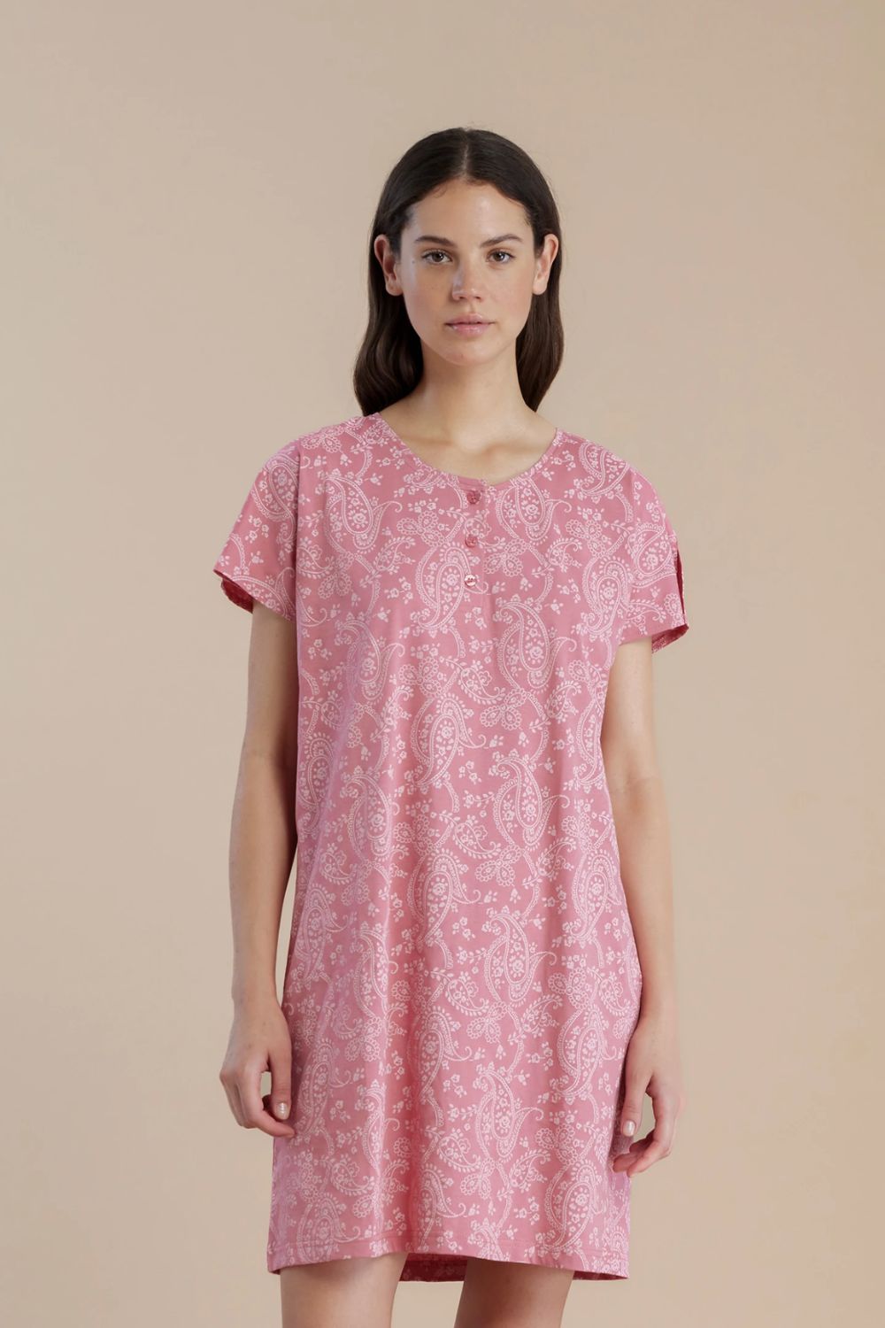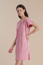 Γυναικείο Νυχτικό Noidinotte με κοντό μανίκι και πατιλέτα, στρογγυλή λαιμόκοψη και paisley print σε αποχρώσεις του ροζ. Φτιαγμένο από 100% βαμβάκι, προσφέρει απαλή αίσθηση στην επιδερμίδα και άνεση καθ’ όλη τη διάρκεια της νύχτας. Ιδανικό για χαλαρές στιγμές στο σπίτι ή για έναν άνετο ύπνο, το νυχτικό αυτό συνδυάζει στυλ και ποιότητα σε κάθε λεπτομέρεια.