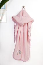 Βρεφική κάπα χρώματος ροζ διαστάσεων 75 x 85 cm, διακοσμημένη με χαριτωμένο κέντημα πελαργό και χρωματιστό ρέλι με μοτίβο συννεφάκια. Κατασκευασμένη από 100% βαμβακερή υποαλλεργική πετσέτα υψηλής απορροφητικότητας, βάρους 400 gr/m² ελεγμένη για επιβλαβείς ουσίες με το παγκοσμίως αναγνωρισμένο πιστοποιητικό, OEKO TEX® Standard 100. Η απαλή υφή της προσφέρει την ιδανική φροντίδα, ενώ η ενσωματωμένη κουκούλα κρατάει το κεφαλάκι του μωρού ζεστό. Συσκευασία δώρου: κουτί πολυτελείας.