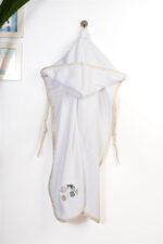Βρεφική κάπα χρώματος λευκού διαστάσεων 75 x 85 cm, διακοσμημένη με χαριτωμένο κέντημα πελαργό και χρωματιστό ρέλι με μοτίβο συννεφάκια. Κατασκευασμένη από 100% βαμβακερή υποαλλεργική πετσέτα υψηλής απορροφητικότητας, βάρους 400 gr/m² ελεγμένη για επιβλαβείς ουσίες με το παγκοσμίως αναγνωρισμένο πιστοποιητικό, OEKO TEX® Standard 100. Η απαλή υφή της προσφέρει την ιδανική φροντίδα, ενώ η ενσωματωμένη κουκούλα κρατάει το κεφαλάκι του μωρού ζεστό. Συσκευασία δώρου: κουτί πολυτελείας.