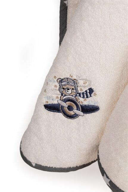 Βρεφική κάπα χρώματος εκρού διαστάσεων 75 x 85 cm, διακοσμημένη με χαριτωμένο κέντημα πελαργό και χρωματιστό ρέλι με μοτίβο συννεφάκια. Κατασκευασμένη από 100% βαμβακερή υποαλλεργική πετσέτα υψηλής απορροφητικότητας, βάρους 400 gr/m² ελεγμένη για επιβλαβείς ουσίες με το παγκοσμίως αναγνωρισμένο πιστοποιητικό, OEKO TEX® Standard 100. Η απαλή υφή της προσφέρει την ιδανική φροντίδα, ενώ η ενσωματωμένη κουκούλα κρατάει το κεφαλάκι του μωρού ζεστό. Συσκευασία δώρου: κουτί πολυτελείας.
