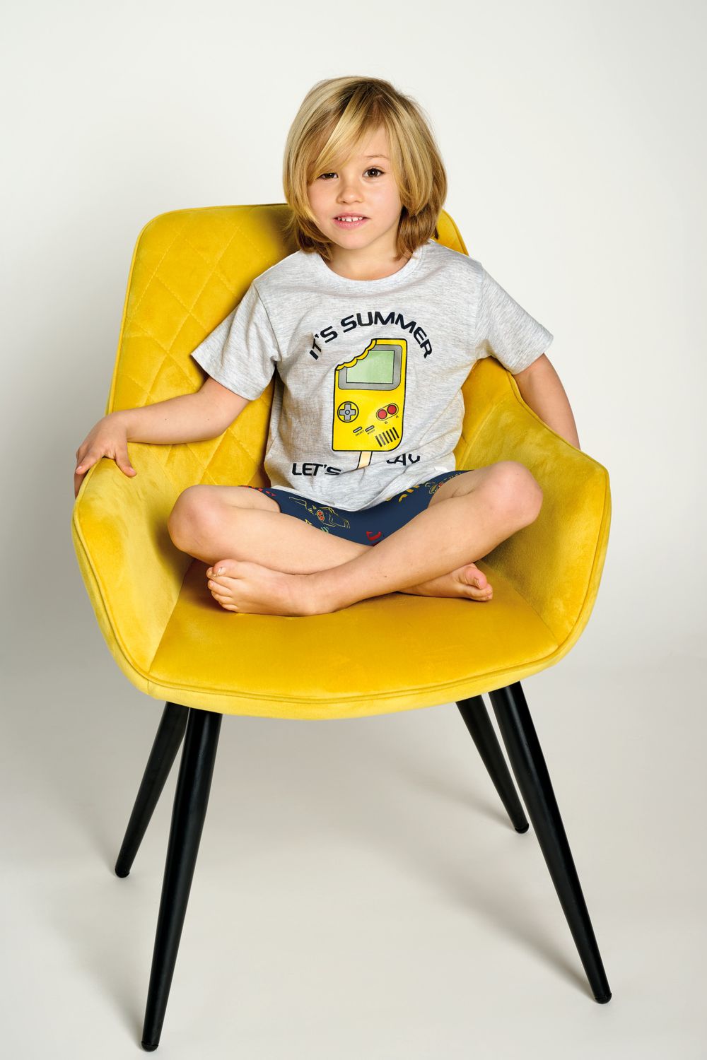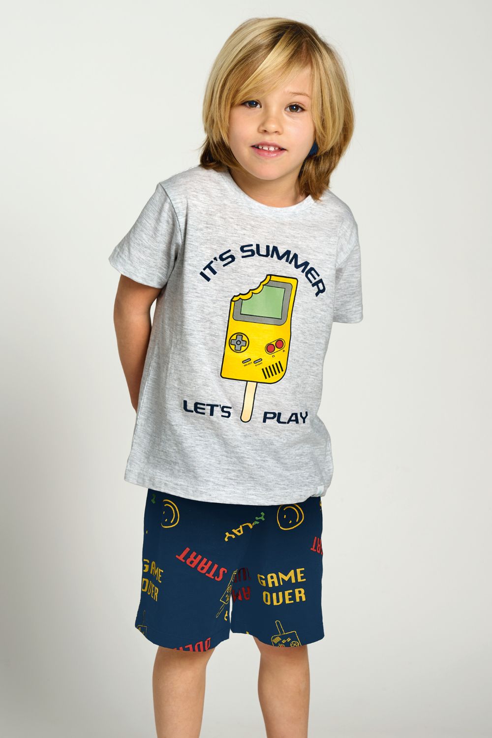 Παιδική πιτζάμα για αγόρια από τη σειρά “Let’s Play” της Muydemi, ιδανική για άνετες και ξέγνοιαστες καλοκαιρινές νύχτες. Κατασκευασμένη από 98% βαμβάκι και 2% πολυεστέρα, προσφέρει απαλή υφή, ανθεκτικότητα και άριστη εφαρμογή. Το σετ περιλαμβάνει κοντομάνικη μπλούζα σε γκρι απόχρωση με παιχνιδιάρικο τύπωμα εμπνευσμένο από video games και μήνυμα “It’s Summer, Let’s Play”, καθώς και σορτσάκι με μοντέρνα σχέδια και στάμπες. Η άνετη γραμμή και η ελαστική μέση εξασφαλίζουν ελευθερία κινήσεων, καθιστώντας την ιδανική επιλογή τόσο για ύπνο όσο και για χαλάρωση στο σπίτι.