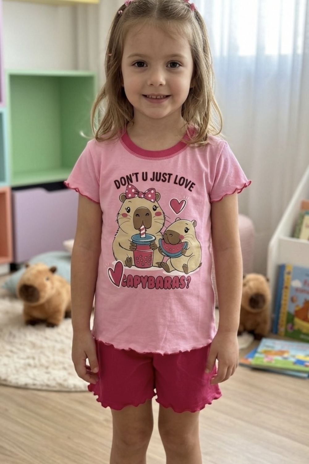 Παιδική πιτζάμα για κορίτσια με χαριτωμένο σχέδιο “Capybaras”, ιδανική για άνετες και ξέγνοιαστες νύχτες αλλά και χαλαρές στιγμές στο σπίτι. Είναι κατασκευασμένη στην Ελλάδα από 100% βαμβάκι υψηλής ποιότητας, προσφέροντας απαλή υφή και εξαιρετική διαπνοή, ιδανική για την ευαίσθητη παιδική επιδερμίδα. Το σετ περιλαμβάνει κοντομάνικη μπλούζα σε ροζ απόχρωση με παιχνιδιάρικο τύπωμα και σορτσάκι που εξασφαλίζει ελευθερία κινήσεων. Ανθεκτική στη χρήση και στα πλυσίματα, αποτελεί μια πρακτική και ταυτόχρονα γλυκιά επιλογή που θα λατρέψουν τα μικρά κορίτσια.