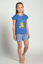 Παιδική πιτζάμα για κορίτσια “Lemonade” της Muydemi, ιδανική για άνετο και δροσερό ύπνο τις καλοκαιρινές νύχτες. Κατασκευασμένη από 100% βαμβάκι υψηλής ποιότητας, προσφέρει απαλή αίσθηση στο δέρμα και εξαιρετική διαπνοή. Το σετ αποτελείται από κοντομάνικη μπλούζα σε χαρούμενη μπλε απόχρωση με παιχνιδιάρικο τύπωμα λεμονάδας και σορτσάκι με καρό σχέδιο και μικρές λεπτομέρειες από λεμόνι, δημιουργώντας ένα φρέσκο και καλοκαιρινό σύνολο. Η άνετη γραμμή και η ελαστική μέση εξασφαλίζουν ελευθερία κινήσεων, καθιστώντας την ιδανική επιλογή για ξεκούραστο ύπνο αλλά και χαλαρές στιγμές στο σπίτι.