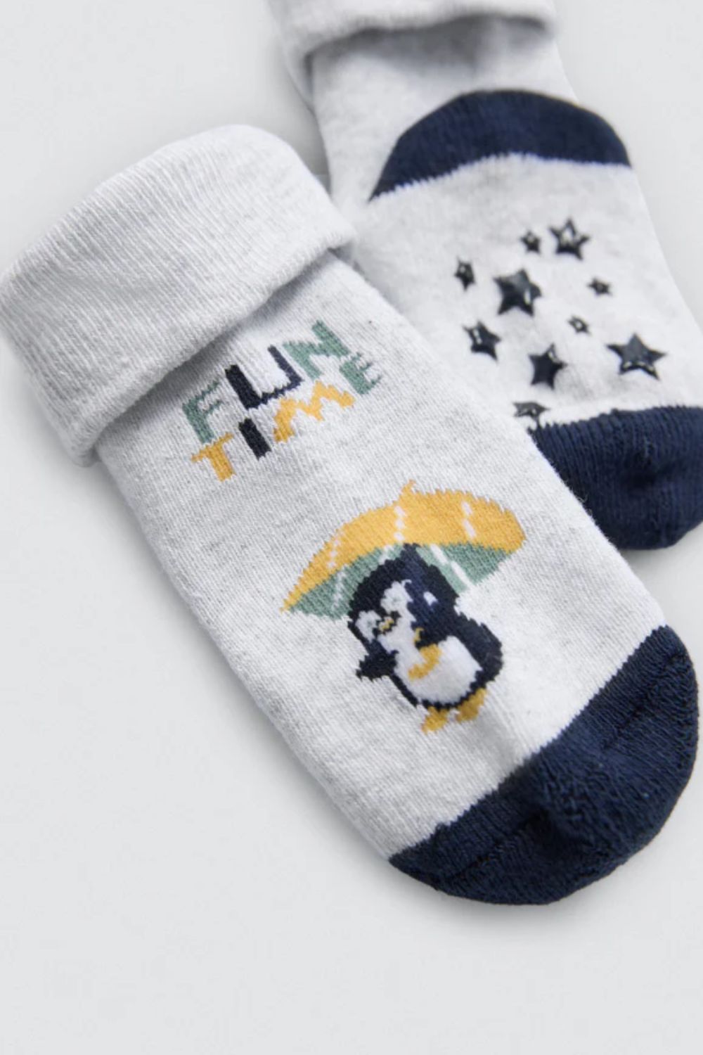 Απαλές και ζεστές βρεφικές κάλτσες Ysabel Mora “Penguin” (2 Pack), ιδανικές για τις πιο δροσερές ημέρες! Το σετ περιλαμβάνει δύο ζευγάρια με χαριτωμένα σχέδια πιγκουίνου, κατασκευασμένα από θερμικό ύφασμα που διατηρεί τα ποδαράκια του μωρού ζεστά και άνετα όλη μέρα. Διαθέτουν αντιολισθητικά πατουσάκια στη βάση για μεγαλύτερη ασφάλεια στα πρώτα του βήματα. Εξαιρετικής ποιότητας, απαλές στην αφή και με τέλεια εφαρμογή, αυτές οι κάλτσες συνδυάζουν άνεση, ζεστασιά και γλυκό στυλ για κάθε μικρό εξερευνητή!
